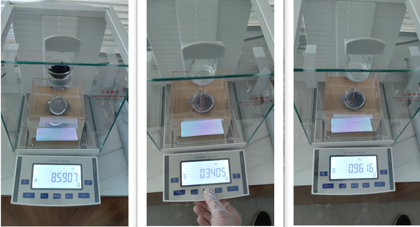 • 把水槽中的網(wǎng)球取出擦干,打開(kāi)并倒入玻璃杯中的塑料顆粒,合上網(wǎng)球,為避免塑料顆粒在放入水中時(shí)產(chǎn)生氣泡影響最終結(jié)果,用酒精浸潤(rùn)網(wǎng)球和里面的塑料顆粒,瀝干后重新將網(wǎng)球放入水槽中的吊籃上,空玻璃杯也放回稱量臺(tái)上,待儀器穩(wěn)定后按下Mode鍵,計(jì)量塑料顆粒在水中的重量為-0.3405g,儀器自動(dòng)計(jì)算結(jié)果并顯示密度為0.9616g/cm?。