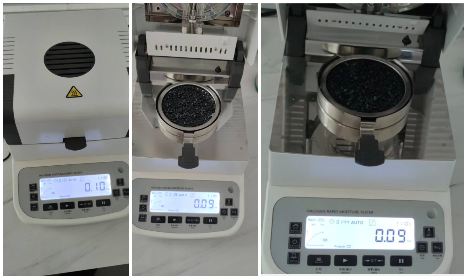 - 復(fù)位儀器,待儀器冷卻至40℃以下后,再取15g左右樣品鋪在樣品盤上,重復(fù)上述測試步驟;測試結(jié)束后得出第三組數(shù)據(jù),顯示樣品的水分含量為0.09%;數(shù)據(jù)基本相同,排除了一、二組測試的小概率巧合,確認(rèn)測定結(jié)果準(zhǔn)確。
