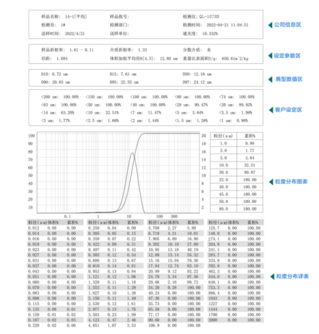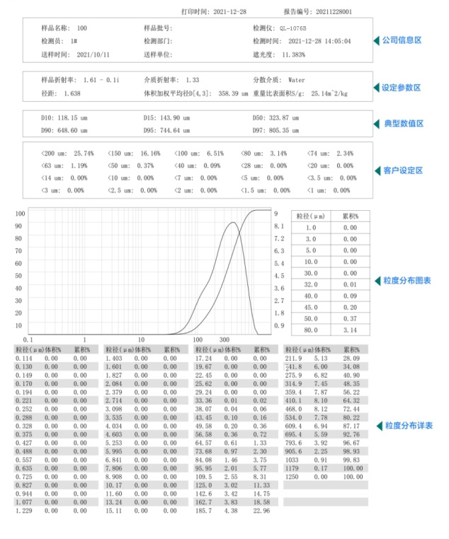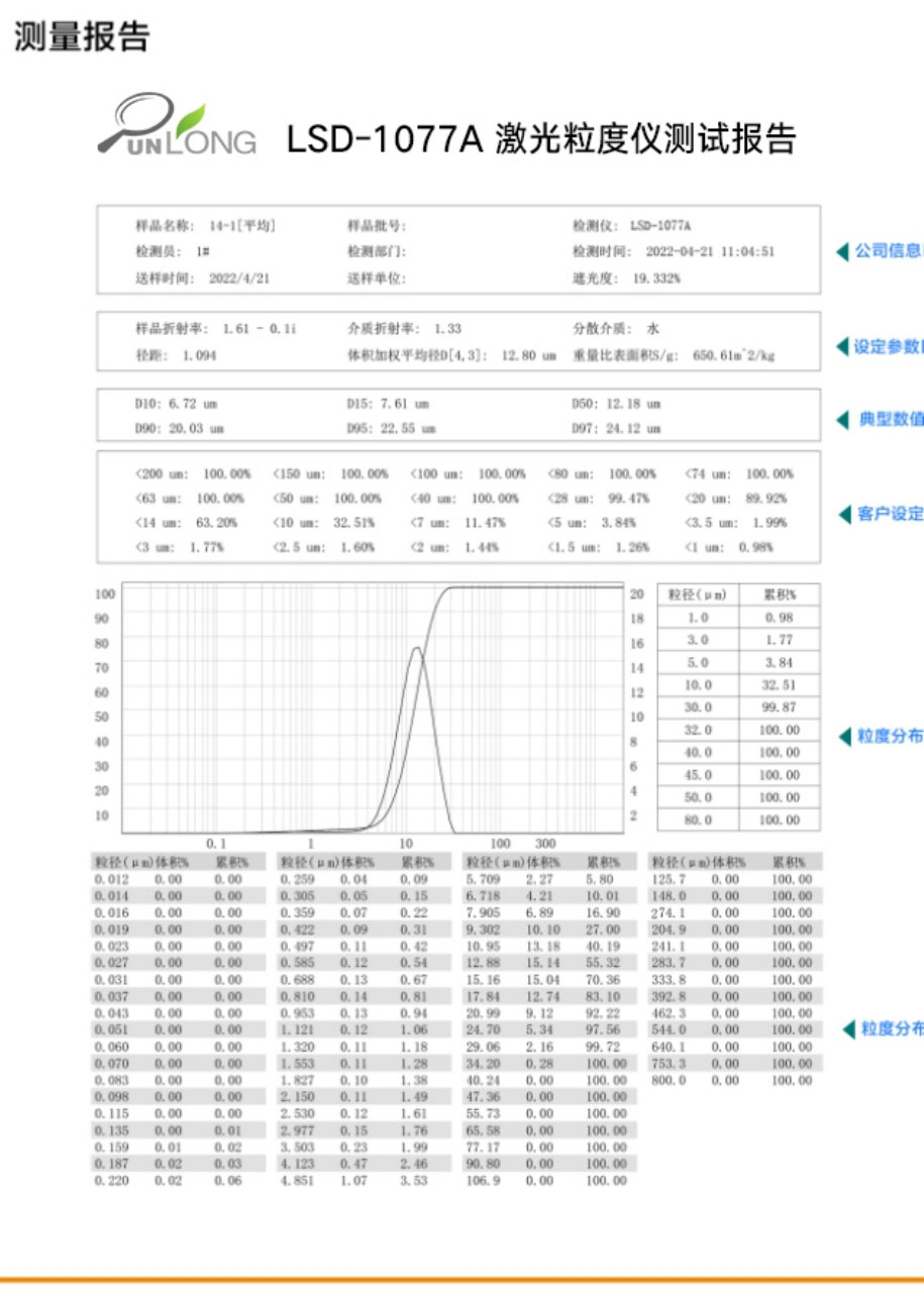 顯示模板 粒徑區(qū)間求百分比,以滿足不同行業(yè)對粒度測試的表征方式。徑距、一致性、區(qū)間累積等等