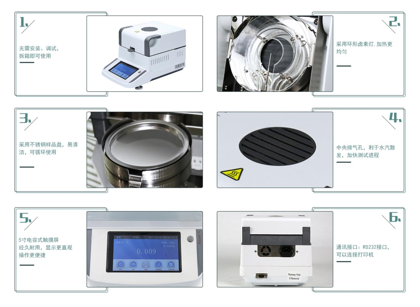 儀器采用加熱失重的原理進(jìn)行測(cè)試,操作簡(jiǎn)單,大部分產(chǎn)品可以在短短幾分鐘就得出準(zhǔn)確的測(cè)試結(jié)果:水分含量,固形物含量,回潮率,干燥率,烘干后重量,測(cè)試溫度,干燥曲線等。