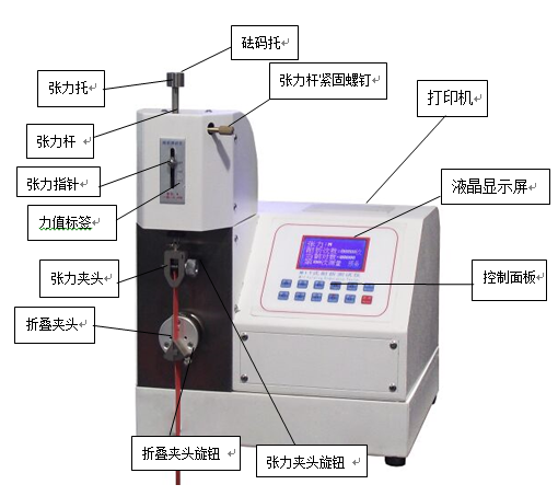 將所配給用戶的砝碼放在張力托上,(小的為4.9N,大的為9.8N)看張力指針是否指在對應刻度上,如有偏差,可用調節(jié)旋鈕調節(jié),使指針對應標準刻度線,而后再將鎖緊旋鈕順時針鎖緊。(調節(jié)旋鈕鎖緊旋鈕的位置見儀器外觀圖)。