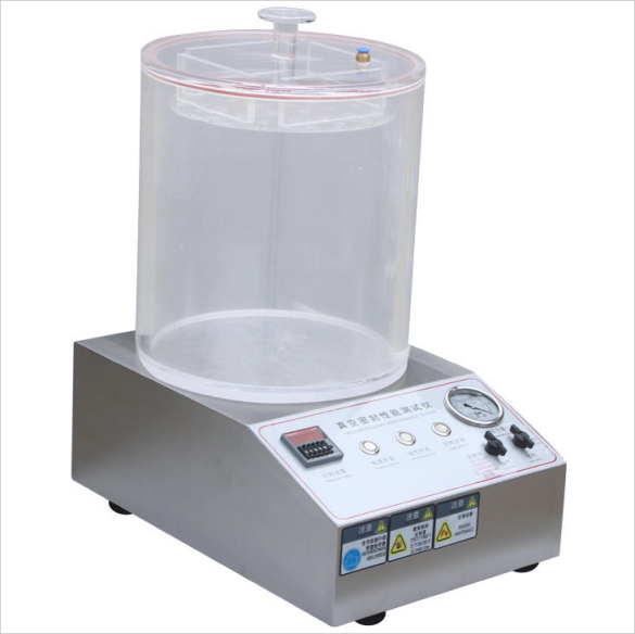 通過(guò)對(duì)真空室抽真空,使浸在水中的試樣產(chǎn)生內(nèi)外壓差,觀測(cè)試樣內(nèi)氣體外逸情況,以此判定試樣的密封性能;通過(guò)對(duì)真空室抽真空,使試樣產(chǎn)生內(nèi)外壓差,觀測(cè)試樣膨脹及釋放真空后試樣形狀恢復(fù)情況,以此判定試樣的密封性能。